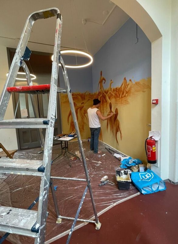 Ter gelegenheid van de nieuwe muurschildering is er een borrel in de hal waar Het Verbond, Café de Richel en Frascati 4 elkaar kruisen.