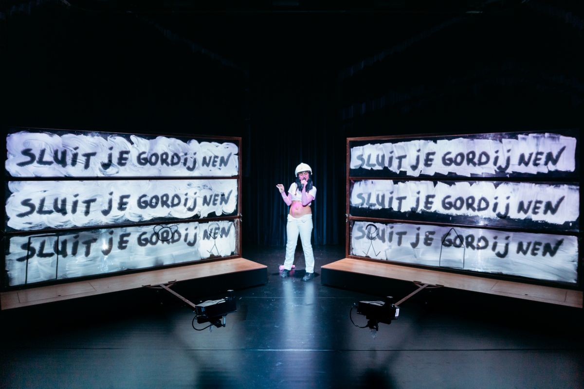 concept, direction and performance Nastaran Razawi Khorasani music Jimi Zoet and Nastaran Razawi Khorasani dramaturgy Tobias Kokkelmans stage design and video Peter van Til (BrotherTill) coach Suzan Boogaerdt costume advice Rebekka Wörmann technical André Goos (Denzo Theater Techniek) and Andy Twillert production Nadine Dijkstra business manager Wilma Kuite (Alles voor de Kunsten) marketing Dieke van der Spek and Leonie Poot photo Mostafa Heravi graphic designer and image processing Maartje de Groot stage photography Julian Maiwald a production from the Kobe collectief co-producers BNG Bank Theaterprijs, Maas Theater and Dance, Theaterfestival Boulevard in collaboration with Het Nationale Theater, We Are Public and Workspacebrussels