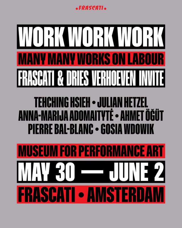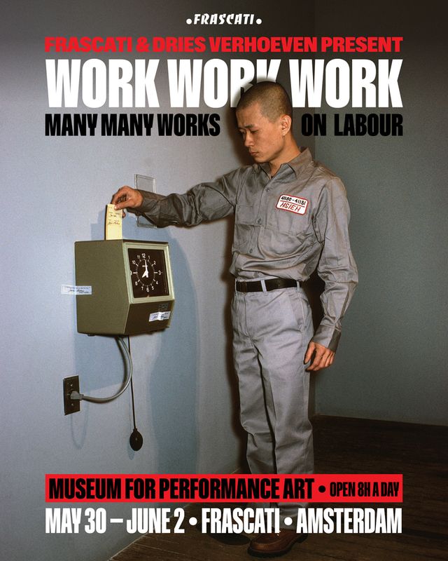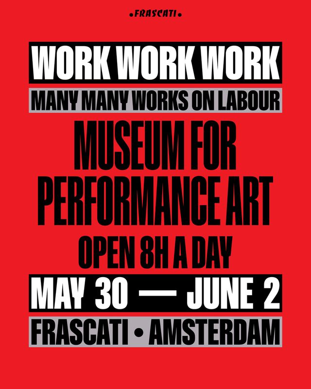 From Thursday, May 30 to Sunday, June 2, Frascati will temporarily open its doors as a museum for performance art during WORK WORK WORK: many many works on labour. The entire building will be used for a group exhibition at the intersection of theater and visual art. Artists including Dries Verhoeven, Julian Hetzel, and Tehching Hsieh will showcase continuous performances and (video) installations about the future of labor in times of automation.