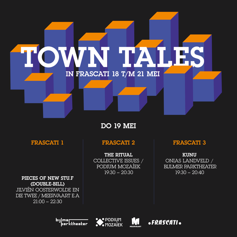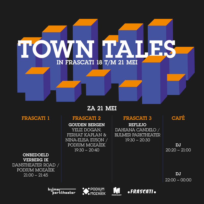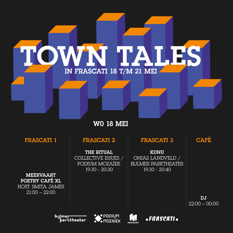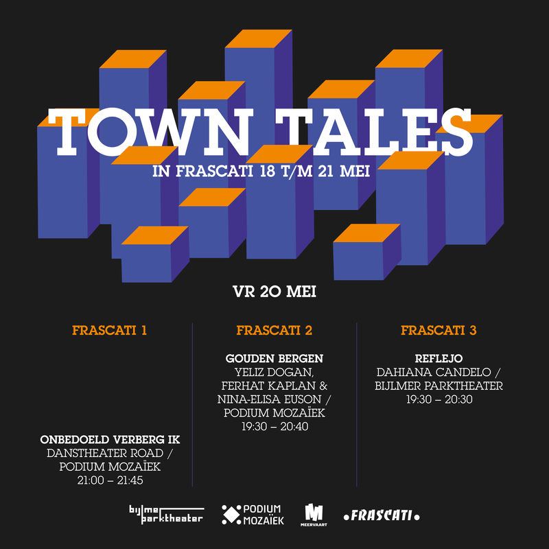 TOWN TALES is een festival waarin Bijlmer Parktheater, Meervaart, Podium Mozaïek en Frascati samenwerken in de organisatie en programmering van nieuwe, diverse theatermakers. Gezamenlijk presenteren zij in Frascati een reeks voorstellingen die bij Bijlmer Parktheater, Meervaart en Podium Mozaïek zijn ontstaan en ontwikkeld. Een vierdaags programma met jong Amsterdams talent dat met theater, dans, spoken word, storytelling (& meer) een nieuw verhaal vertelt. Hun verhaal.